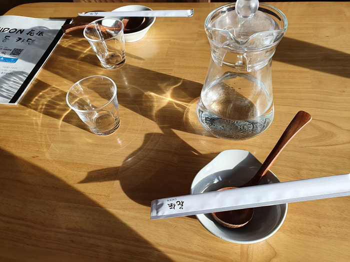 테이블마다 예약한 분들을 위해 놓여진 물과 그릇