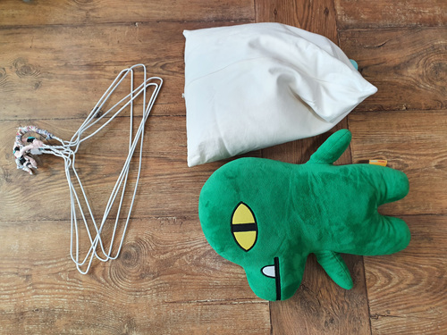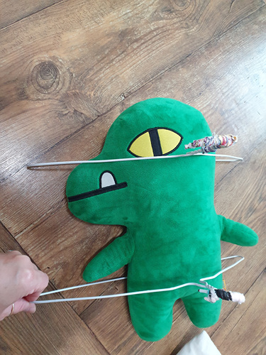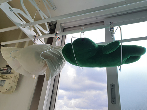 인형 위 아래 옷걸이 하나씩 끼운 뒤 건조대에 걸어주면 됩니다. 간단하죠.