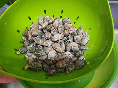 해감이 잘 된 바지락을 깨끗이 헹궈서 칼국수 끓일 준비를 했습니다.