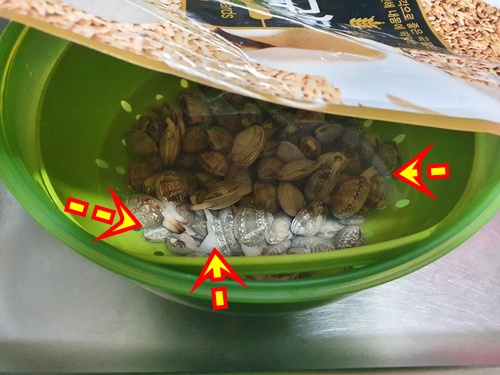 1시간 후..... 소금물에 담궈 뒀던 바지락이 훨씬 해감을 잘 하고 있었습니다.