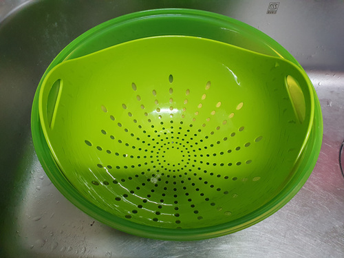 이건 저만의 방식인데요. 해감이 되면 모래가 잘 빠질 수 있도록 망이 있는 볼에 바지락을 담아 줍니다.