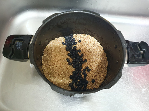 압력밥솥에 넣어 가스불에 올린 뒤 추 소리가 나면 약 3분간 둔 뒤 불을 끕니다.