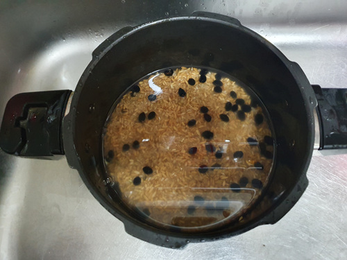 여기에 물을 자작하게 부어 압력밥솥에 밥을 한번더 합니다. 추 소리가 나면 약 2~3분간 둔뒤 불을 끄면 됩니다.