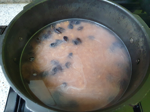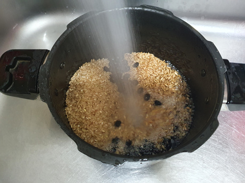 압력밥솥에 넣어 가스불에 올린 뒤 추 소리가 나면 약 3분간 둔 뒤 불을 끕니다.