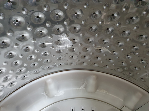 이곳저곳 세탁기 안에 붙어 있는 구스털입니다. 다른 옷들을 세탁하기 전에 이 구스털부터 제거해 줘야 하는데요. 손으로 일일이 제거하기 쉽지 않는게 현실...