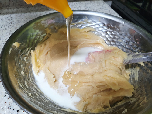 반죽 후에는 설탕이나 꿀을 넣어 줍니다. 전 꿀을 넣었어요.