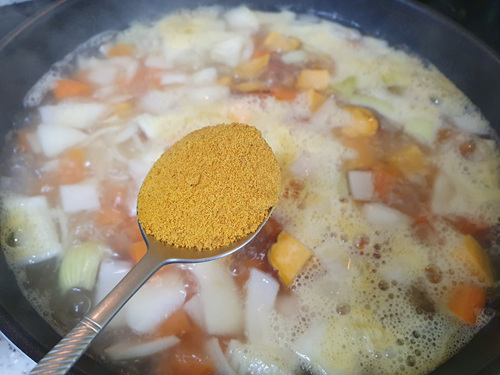 채소 넣은 물이 끓기 시작하면 카레를 조금씩 넣으면서 농도를 조절합니다.