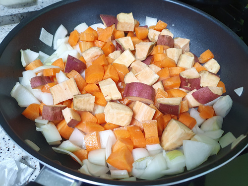 재료가 다 준비 됐다면 양파 - 당근 - 고구마 순으로 기름에 볶아 줍니다.