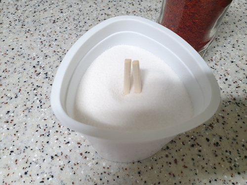 고춧가루 통에 나무젓가락을 반으로 잘라 넣어 두면 습기 제거에 효과가 있거든요. 그런 이유에서 고춧가루가 뭉치는 일도 없고요.