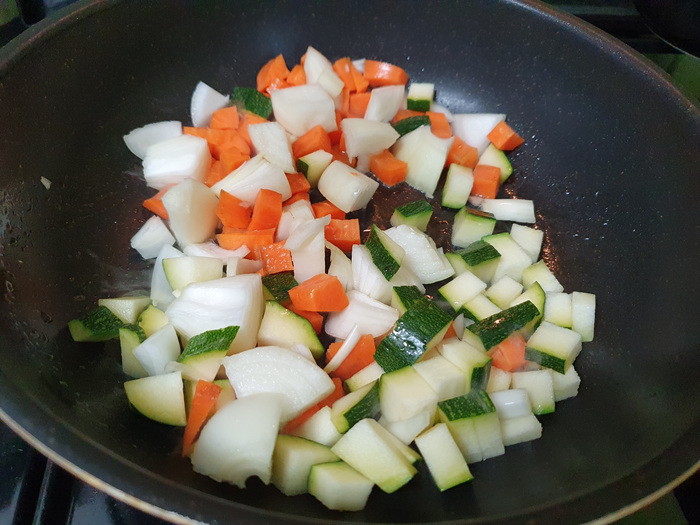 먼저 채소를 기름에 볶아 줍니다.