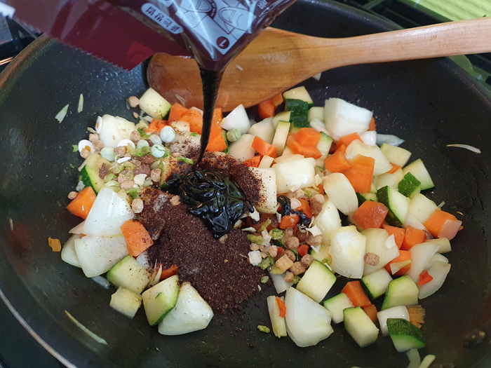 볶아진 채소에 짜장스프를 넣어 줍니다. ( 전 짜장라면이 달라 분말스프, 액상스프를 넣었습니다. )