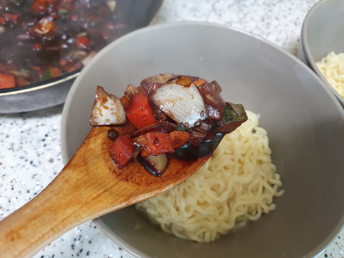 짜장소스가 정말 맛있게 잘 만들어졌어요. 면은 물을 버린 후 그릇에 담아 줍니다.
