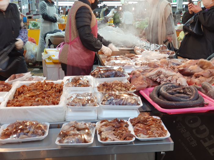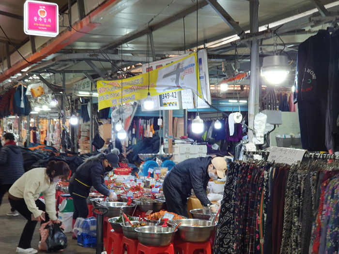제주도에서 나름 제일 크다는 오일시장인데 평소와 달리 사람들이 그렇게 많지 않았다. 아마도 코로나19 영향때문일런지도 모른다. 예전에 갔을때는 사람들과 부대끼며 걸었던 기억이 있는데 지금은 한결 여유로운 시장의 모습이었다.