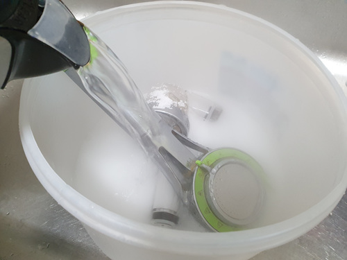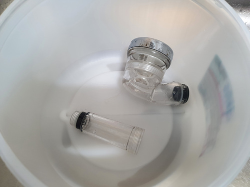 꼬질한 수전들을 통에 담고 과탄산소다를 뿌려 살균 세척하기로 했습니다.