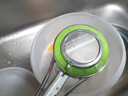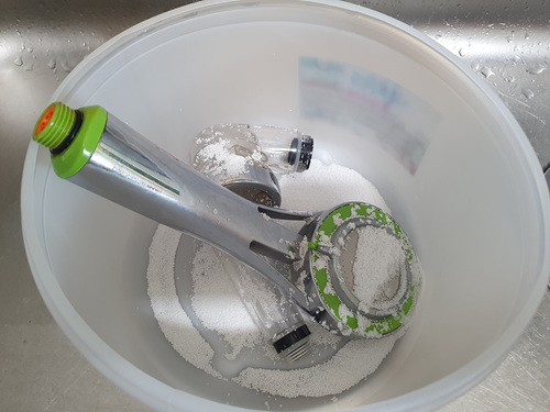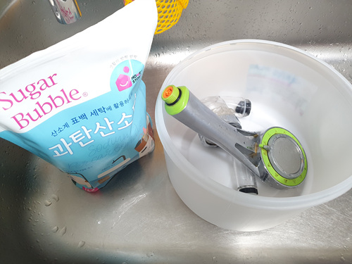 과탄산소다에 담궈 놓기만 해도 잘 닦기 힘든 부분은 물론 물이 나오는 부분도 완벽하게 이물질이 제거됩니다.