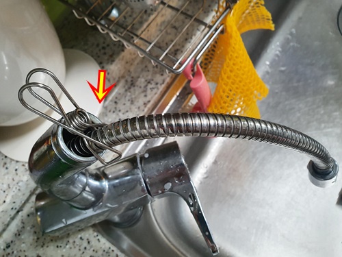 싱크대 연결된 수전 줄은 집게를 이용해 고정해 뒀습니다. 수전을 씻을때 혹시나 안쪽으로 줄이 빠지면 안되니까요.