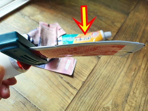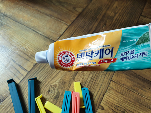 치약에 집게를 꽂아 한쪽으로 밀어주면 깔끔하게 치약을 사용할 수 있습니다.