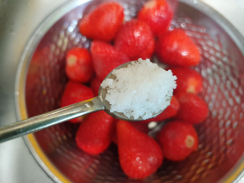 그다음은 물을 버린 뒤 1분 동안 소금물에 담가 놓습니다. 소금물에 담그는 이유는 살균, 불순물 제거는 물론 당도를 상승시켜 주기 때문입니다.