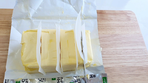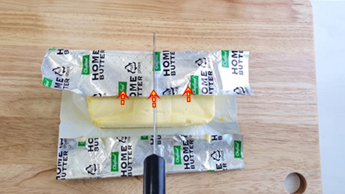 이런 방법으로 버터를 자르면 손에 버터가 묻지 않고 자를 수 있어요.