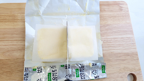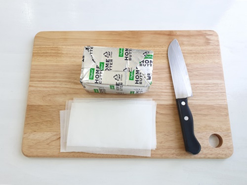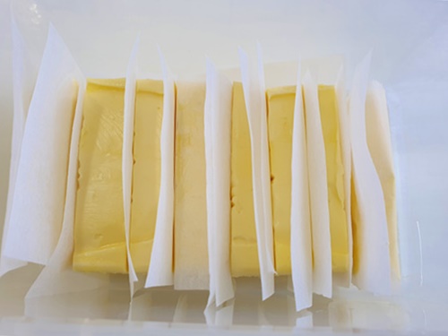 이런 방법으로 버터를 자르면 손에 버터가 묻지 않고 자를 수 있어요.