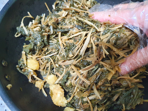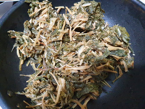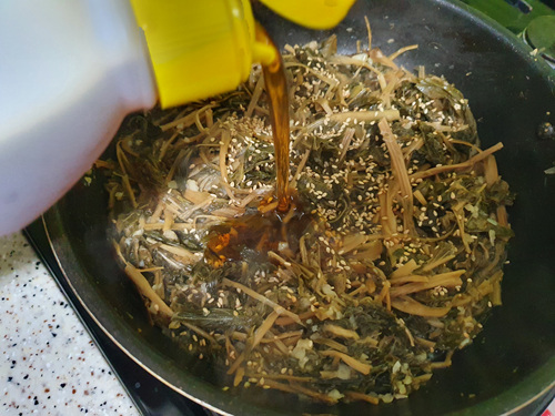 마지막엔 깨소금, 참기름을 넣고 조물조물 묻히면 음식점에서 먹던 그 맛 그대로 취나물 반찬이 됩니다.