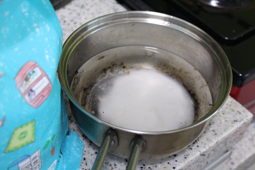 홀라당 탄 냄비에 과탄산소다 한 스푼과 물을 적당량 넣고 그냥 팔팔 끓여 주기만 하면 됩니다.