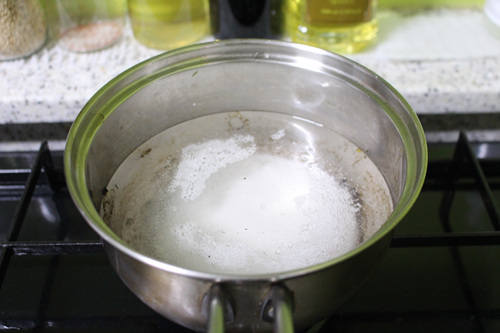 가스레인지에서 중불로 물을 팔팔 끓입니다.