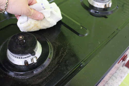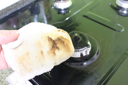 마무리는 물기를 꼭 짠 행주를 이용해 닦아주면 가스레인지 청소 끝입니다.