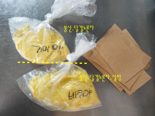 이렇게 개미 약과 바퀴약을 만들었다면 비닐백에 넣어 표시를 해 두면 나중에 사용하기 수월하겠죠.