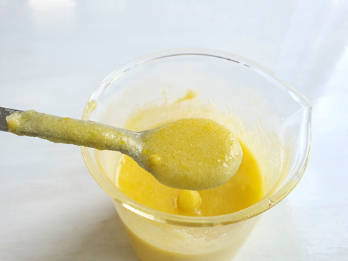 걸쭉한 상태에 달걀노른자를 넣어 으깨어 줍니다.