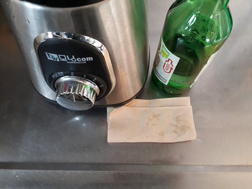 티슈에 소주를 묻혀 믹서기 외부 닦아 주세요.