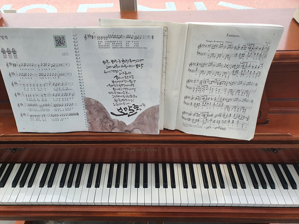 버스정류장 안쪽 벤치가 있는 곳에 들어가니 진짜 피아노가 있었고 악보도 몇 권 있더라고요.
