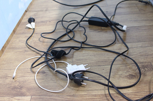 방에 어지럽게 나뒹구는 충전용 선입니다.