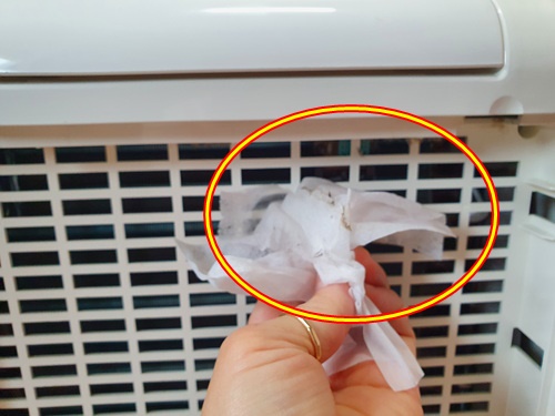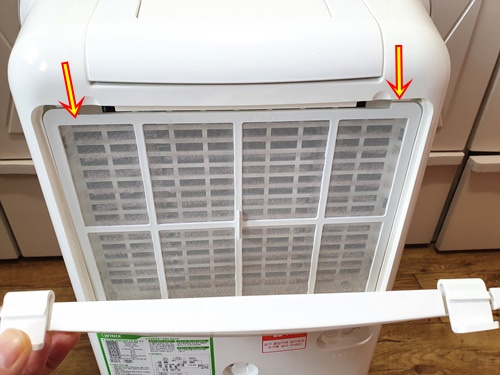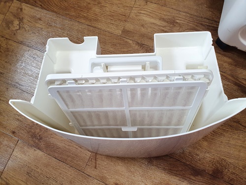 필터 분리하고 난 뒤 제습기 안쪽을 보면 이곳도 먼지는 물론 물 때문인지 곰팡이가 끼어 있어요. 이곳도 깨끗이 닦아줘야 합니다.