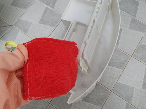먼지를 제거한 후엔 세제를 묻혀 양파망으로 닦아 줍니다. 수세미와 달리 부드럽고 정말 때가 잘 제거됩니다.