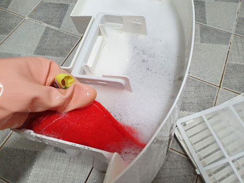 비가 자주 오는 날엔 거의 24시간 풀가동하다 보니 이내 먼지랑 곰팡이인지 때인지 끼는 것 같아 제습기 청소를 하기로 했어요. 제일 먼저 제습기 물통을 빼 주세요. 물을 항상 머금고 있으니 물을 제대로 비워도 희한하게 누런 물때 비슷한 게 끼더라고요. 이건 꺼내 세제 넣고 씻어야 해요.