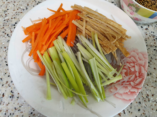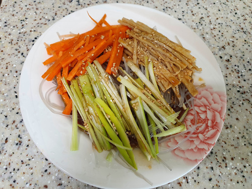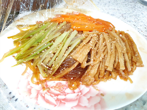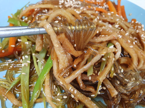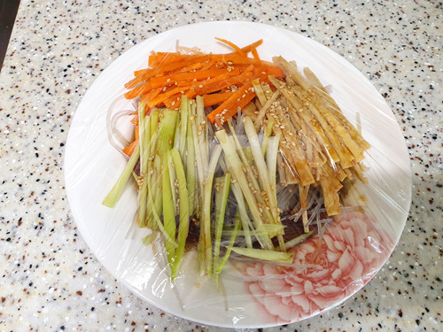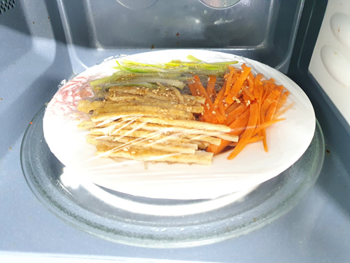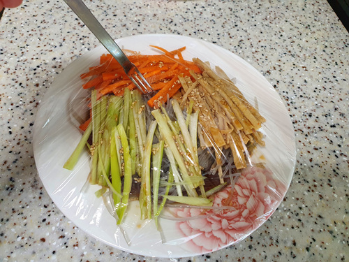 7. 전자레인지에 꺼낸 뒤 각종 채소와 당면을 잘 섞으면 맛있는 잡채 완성입니다.