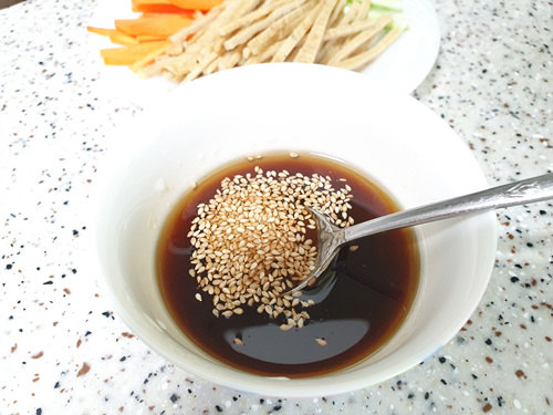 2. 양념을 만듭니다. 양념재료는 간장 2큰술, 설탕 1큰술, 참기름 반 큰 술, 마늘 작은 반티 스푼, 물 15ml (1 ~2인 분 기준 )