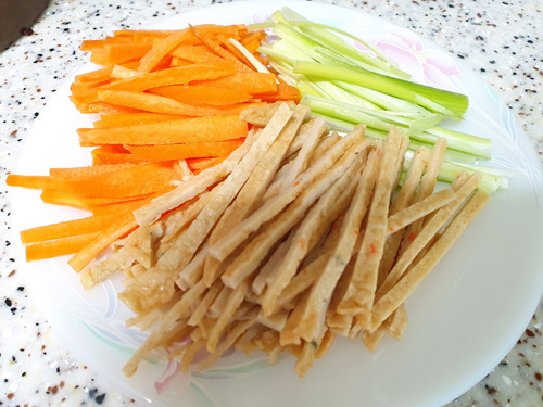 3. 잡채에 넣을 각종 채소와 재료 준비 ( 전 당근, 어묵, 대파를 준비했어요. ) 만약 집에 버섯이나 양파가 있음 같이 넣으면 더 맛있을 거예요.