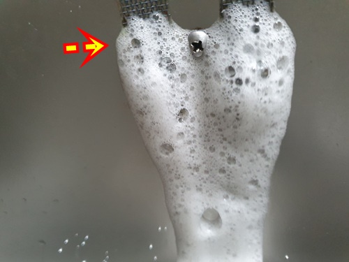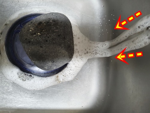 이번 사진 보시면 조금 이해가 가실 것 같아요. 꽉 막힌 배수구로 인해 싱크대 옆면 구멍 사이로 거품이 나옵니다. 이때 안쪽의 찌든 때까지 완벽하게 없애줍니다. 물론 힘들이지 않고 자동으로 말이죠.