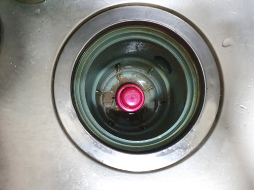 배수구 안쪽 물 내려가는 구멍이 있는데요. 그곳에 섬유유연제 뚜껑을 닫습니다. 희한하게 뚜껑이 딱 맞더라고요.