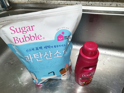 싱크대 배수구 청소할 때 꼭 필요한 것은 과탄산소다입니다. 그리고 중요한 것 한 가지 섬유유연제 뚜껑입니다.