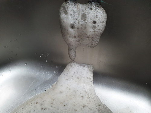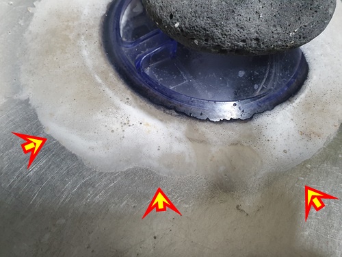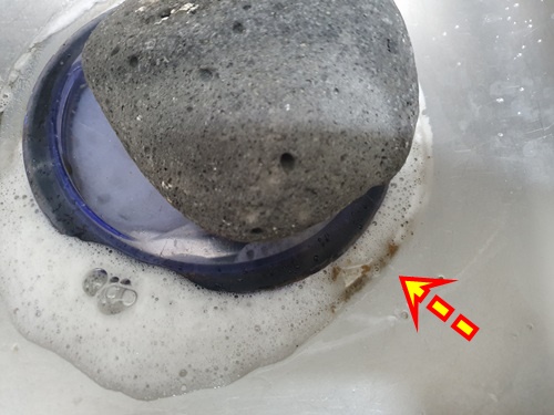 싱크대 옆면에서 시꺼먼 거품이 나옵니다. 자세히 보시면 안쪽에서 생긴 찌든 물때가 나오는 것이지요.