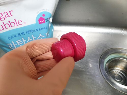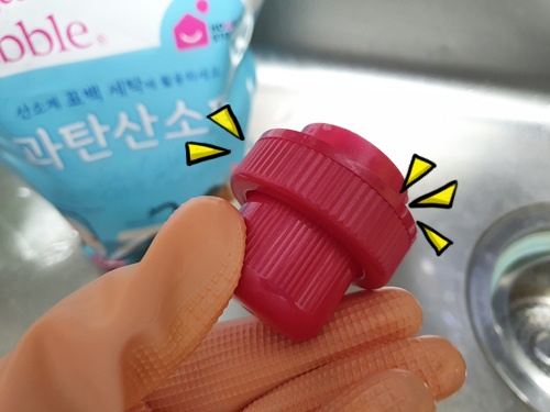 돌을 뚜껑 위에 올려 두면 과탄산소다가 부글부글 끓으면서 뚜껑이 열리지 않아요.