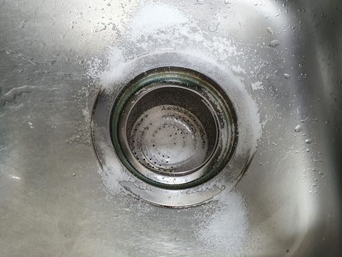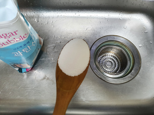 과탄산소다를 싱크대 배수구 주변에 솔솔 뿌려 줍니다. 한 스푼이면 족해요. 많이 넣으면 좋겠지만 굳이 꼬질꼬질 때가 많지 않다면 한 스푼이 딱 적당하더라고요.