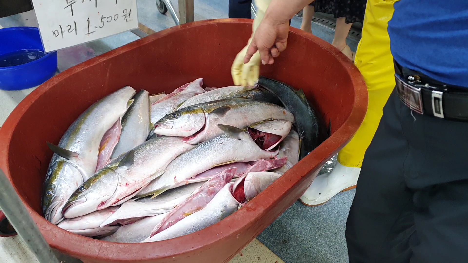 한 사람 두 사람 단돈 1,500원이란 바코드를 붙여서 포장된 모습을 본 주변 사람들도 이내 부시리를 사가는 모습이다.