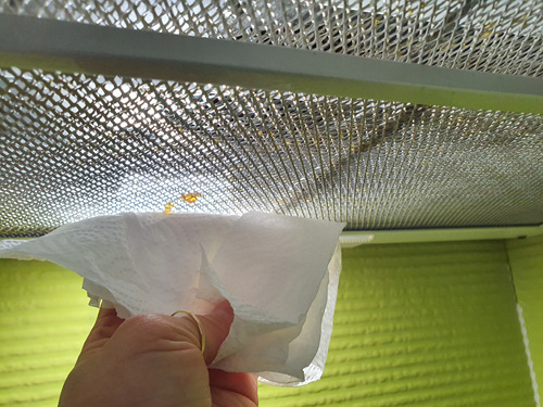 후드 돌아가는 곳의 전원을 끄고 일단 키친타월도 닦아 냈습니다. 그런데 겉에 있던 기름은 닦였는데 안쪽은 잘 닦이지 않아 손소독제로 닦기로 했습니다.