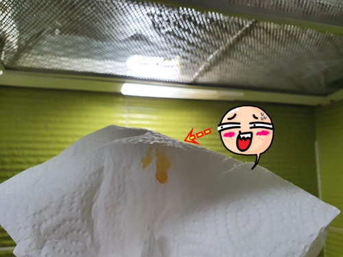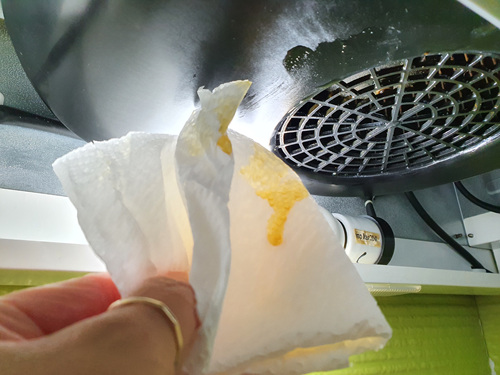 자세히 보니 기름이었어요. 나름대로 일주일에 한 번씩 청소를 하는데요. 이렇게 기름이 떨어지는 것을 보니 할 말을 잃게 만들더라고요. 아무래도 날씨가 더워서 안쪽 깊숙한 곳 즉, 손이 닿지 않았던 곳에 붙어 있던 기름이 열기에 녹아 흘러내리는 것 같더군요.