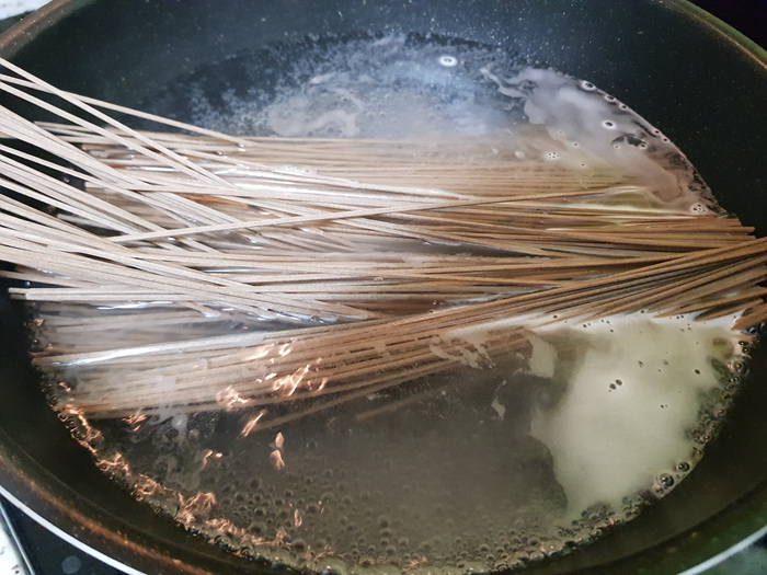 그리고 메밀만 삶으면 되는데요. 물이 팔팔 끓어오르면 찬물을 넣고 한 번 더 삶으면 쫄깃하게 메밀이 잘 삶아집니다.