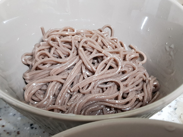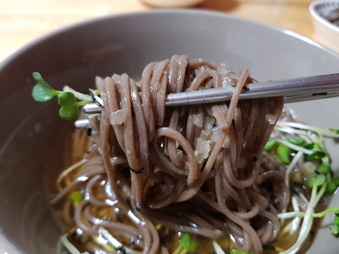 찬물에 헹군 메밀은 물기를 제거하고 육수와 고명으로 마무리하면 맛있는 메밀국수가 완성됩니다.